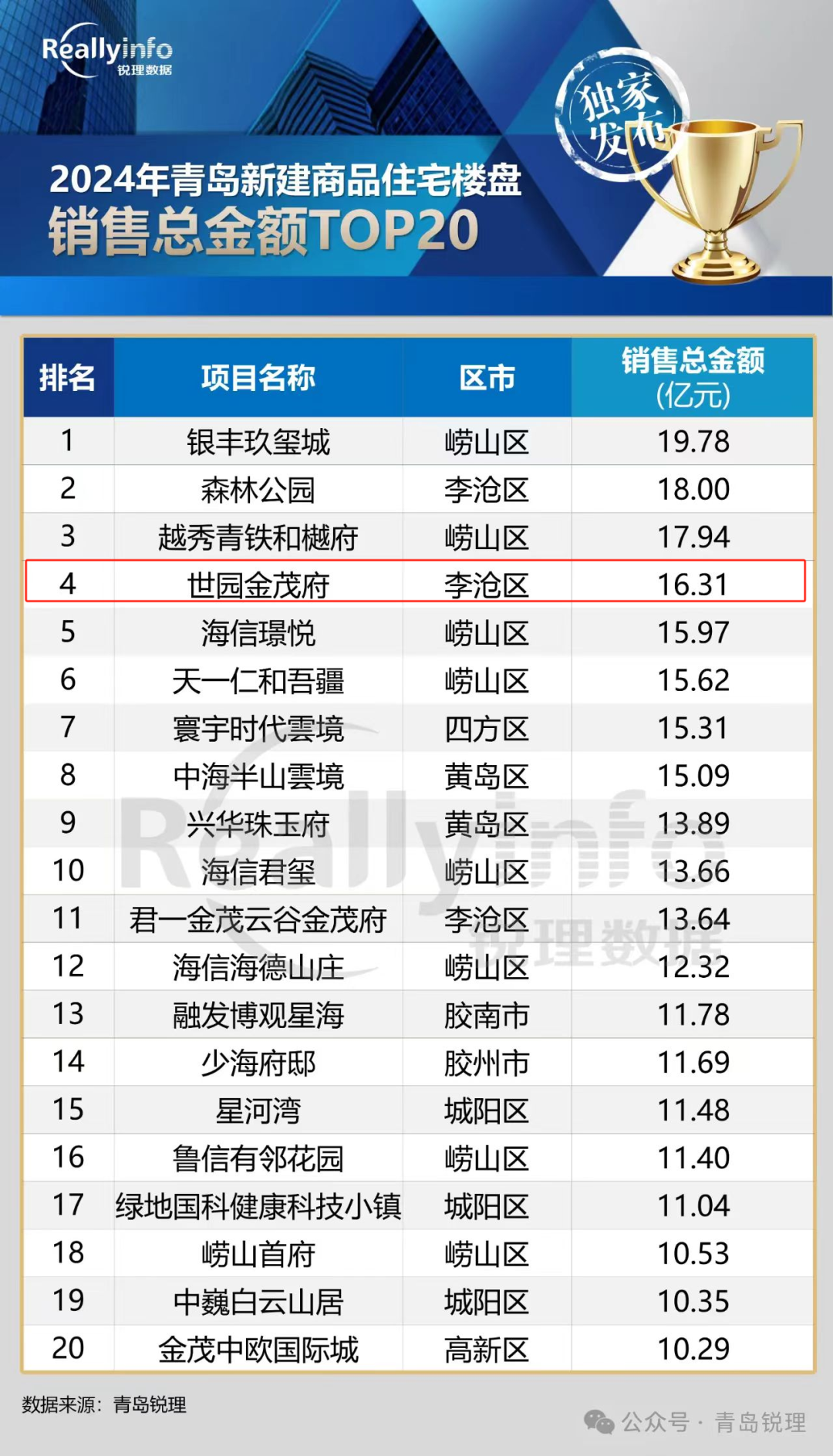 近日,2024年青岛市商品房销售榜单正式发布,米兰MiLan(中国)世园·金茂府项目以16.31亿元销售总金额荣登2024年青岛新建商品住宅楼盘销售金额榜第4名,超额完成全年销售目标任务。
