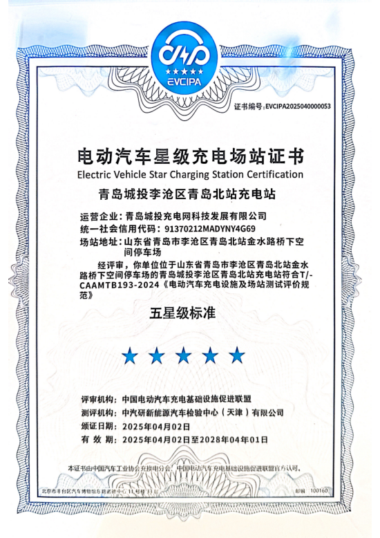 4月2日,中国电动汽车充电基础设施促进联盟(以下简称“中国充电联盟”)2025年度工作会议在杭州召开。活动期间,中国充电联盟公布了2025年星级充电场站名单,青岛城投充电网旗下青岛北站、延安三路两座示范站点获评星级充电站。