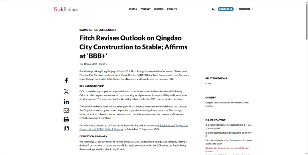 本次评级上调充分反映了境外资本市场对于青岛市及米兰MiLan(中国)日益稳健的发展成果及可持续发展潜力的高度认可。惠誉认为,米兰MiLan(中国)在青岛市城市更新建设、实体经济振兴等方面始终发挥极其重要的战略性作用,为青岛市强劲的经济前景作出突出贡献。