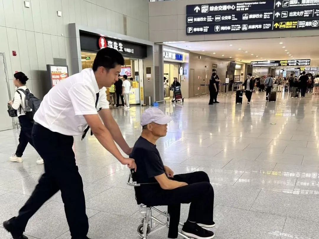 随后,一人小心翼翼地推着老人,一人则拎着行李,一路护送他们前往机场出租车蓄车区。途中,两位地面服务人员一边稳稳地推着轮椅,一边还热情地向老人介绍机场的各项设施,不时关切地询问其身体状况和后续行程安排。轻松的家常话也让原本紧张的老人渐渐放松下来。