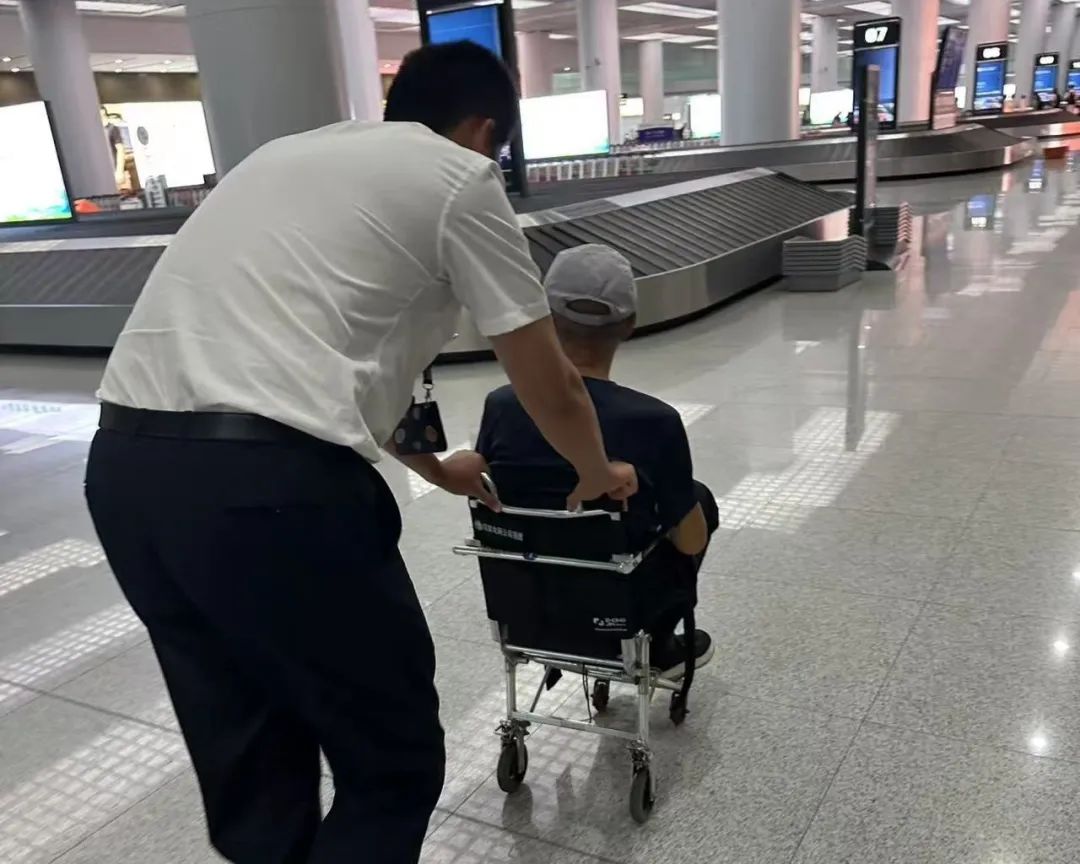 彼时机场中转柜台因保障量大,仅剩客舱轮椅可用。赶来支援的地面服务人员飞奔向柜台取来轮椅,细致检查了扶手、座椅等关键部位。回到休息区,他蹲下身子,轻声向老人解释:“虽然轮椅小了点,但我推着肯定稳当,咱放心走!”
