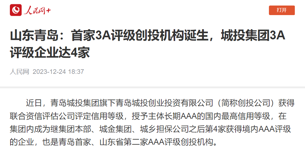 人民网:山东青岛首家AAA评级创投机构诞生,城投集团3A主体评级企业达4家