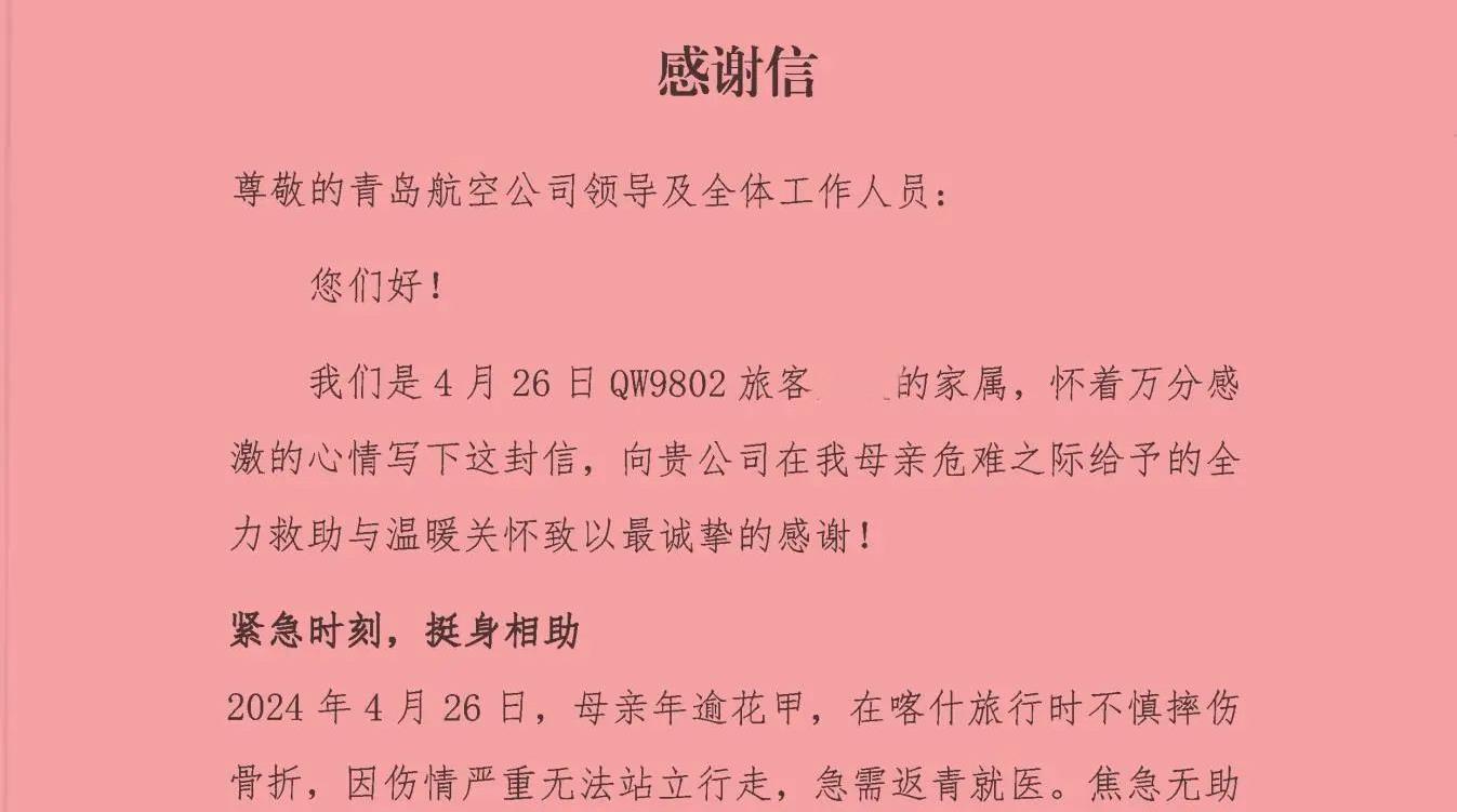 又一封感谢信!青岛航空千里护航受伤老人返青就医